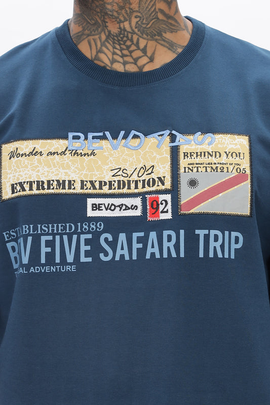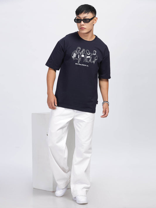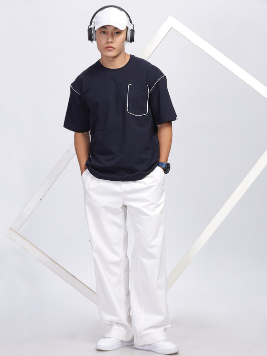Contrast Stitch Navy Blue Drop Shoulder T-Shirt