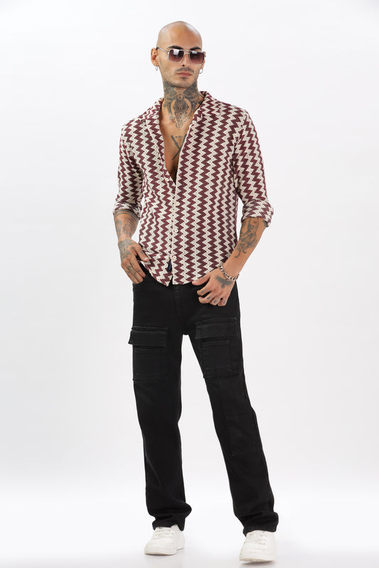 Maroon Zigzag Crochet Cuban Collar Shirt